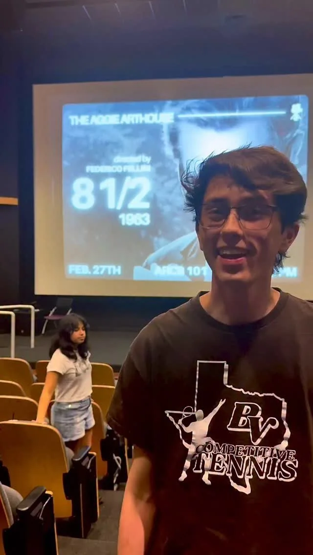The Aggie Arthouse is a film society founded on the Texas A&M University campus in 2024. Our student organization was formed to bring together a diverse community of film-lovers by hosting FREE screenings of arthouse, foreign and classic cinema. By giving the student body a chance to explore the wide, wonderful world of cinema right on our own campus, we hope to create more conversations surrounding film. But we don’t just show movies – we create experiences. Check out more about our organization here.
